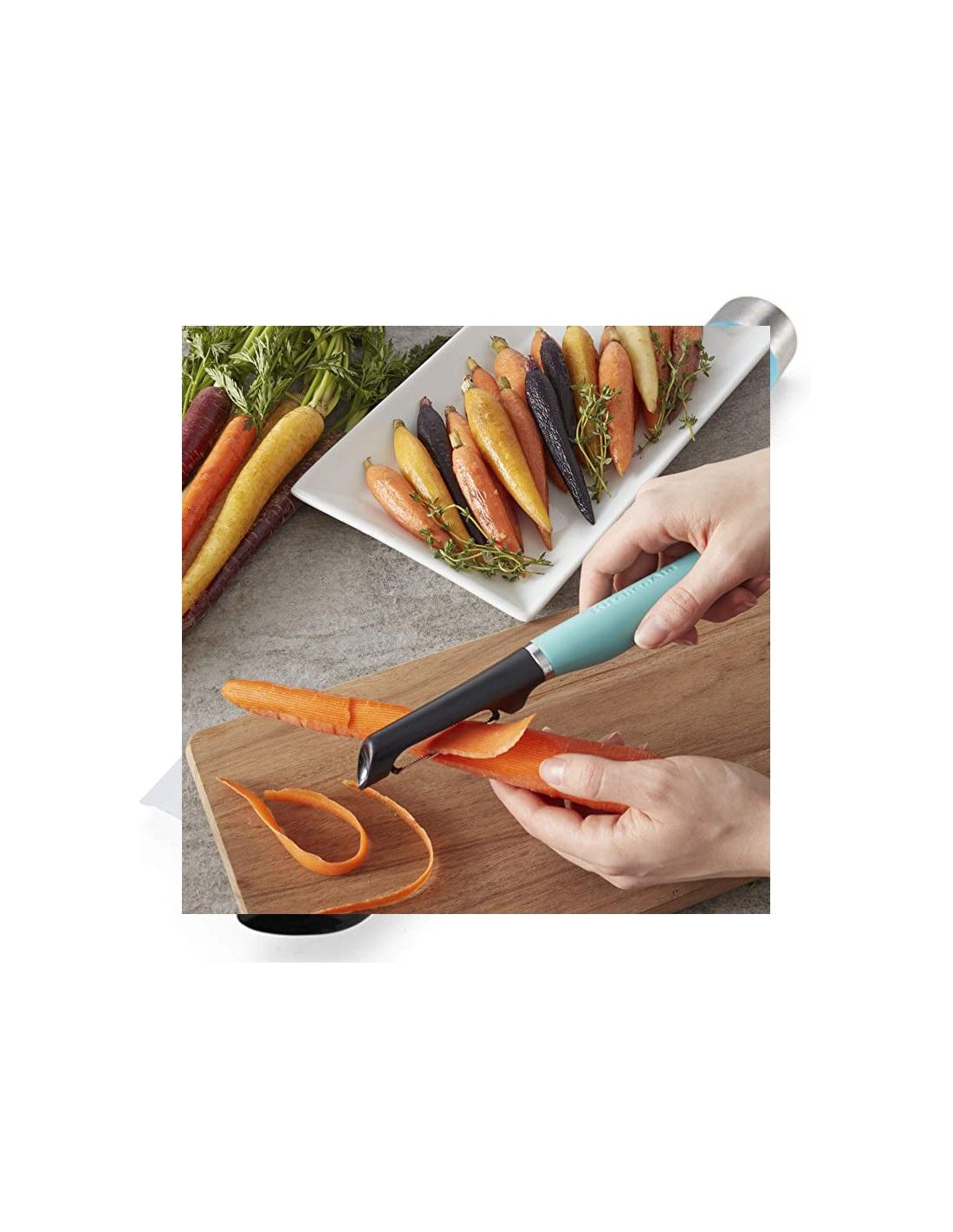 - Acero inoxidable: El pelador de alimentos cuenta con una hoja dentada de doble filo de acero inoxidable, diseñada para pelar todo tipo de frutas y verduras.