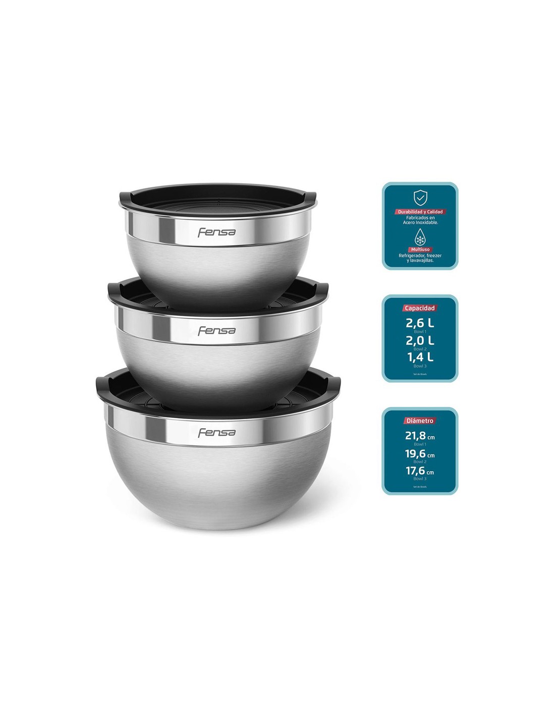 - Cada bowl incluye su tapa plástica para almacenar alimentos.