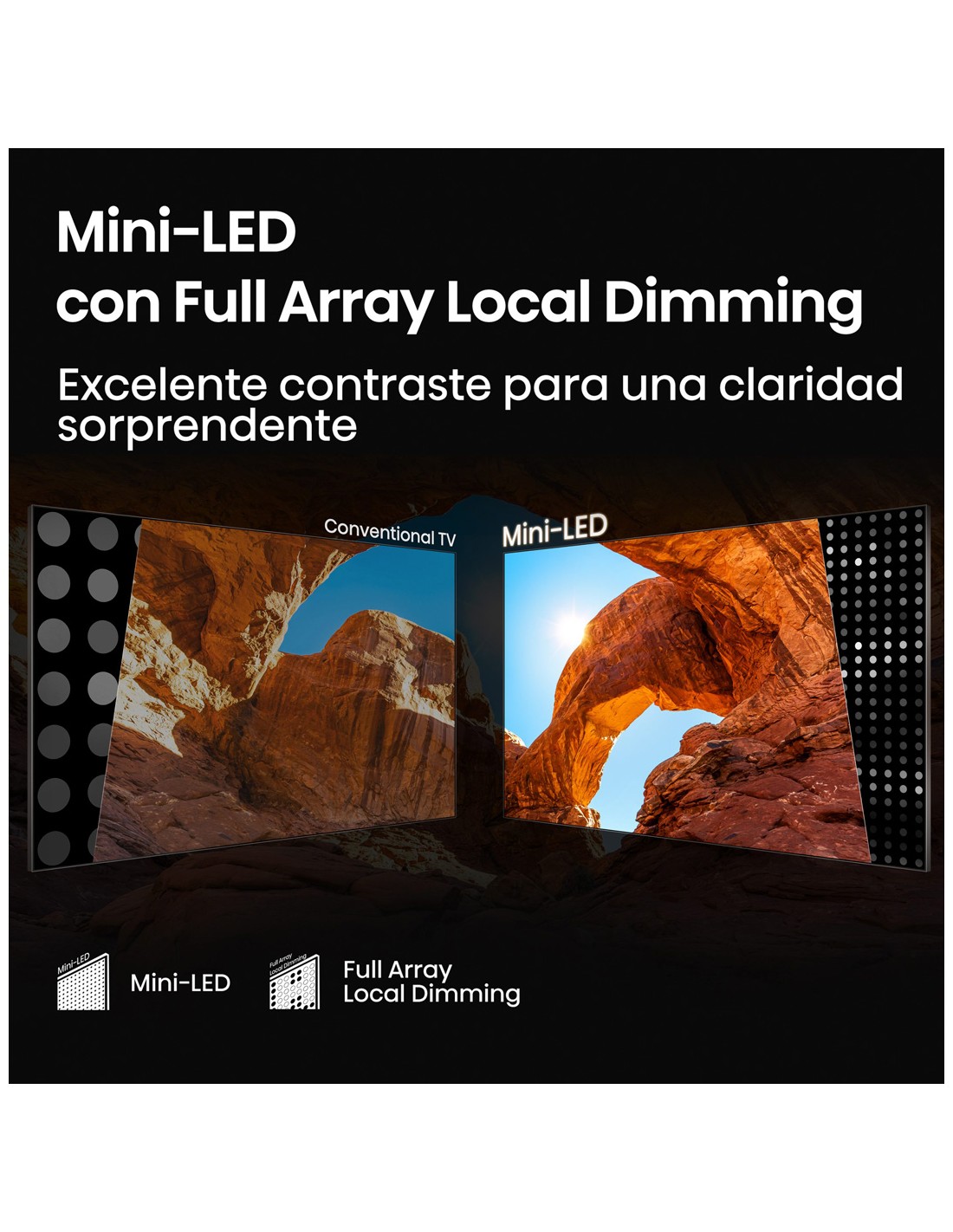 - Mini Led: La nueva tecnología Mini-LED brinda iluminación con menor efecto de dispersión, logrando imágenes perfectamente bien definidas y elevando el nivel de contraste. Admira una imagen ultra precisa con detalles impresionantes en la oscuridad a través del Mini-LED