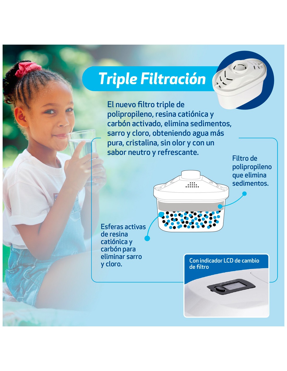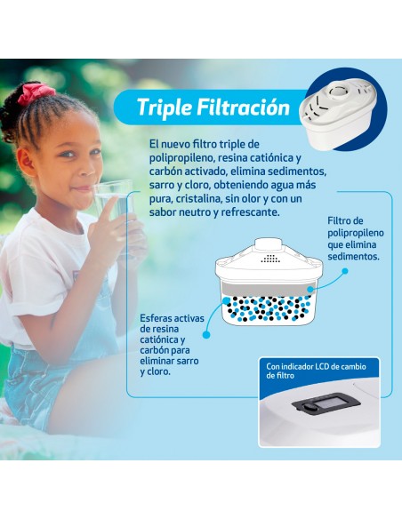 - Triple filtrado: Elimina sedimentos, sarro y cloro